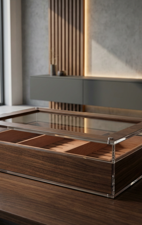 Hochwertiges Acrylgehäuse mit Zedernholzeinsatz.